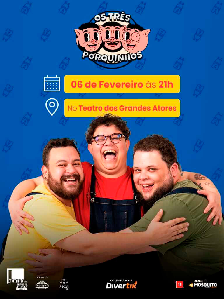 Depois de vários conteúdos juntos que bombaram nas redes sociais, chegou a hora de ver o que eles tem de melhor no palco! Os 3 Porquinhos são o grupo de comédia do momento! Os três comediantes mais fofos do país se juntaram para um espetáculo com stand up, música, imitações e interações que proporcionam ao público uma experiência única a cada apresentação, nenhum show é igual. Estevam Nabote, Victor Ahmar e Vini Maga são uma junção de humor moderno, limpo e na medida entre o popular e o non sense. Você vai rir muito, só não sabemos se pelos motivos certos.