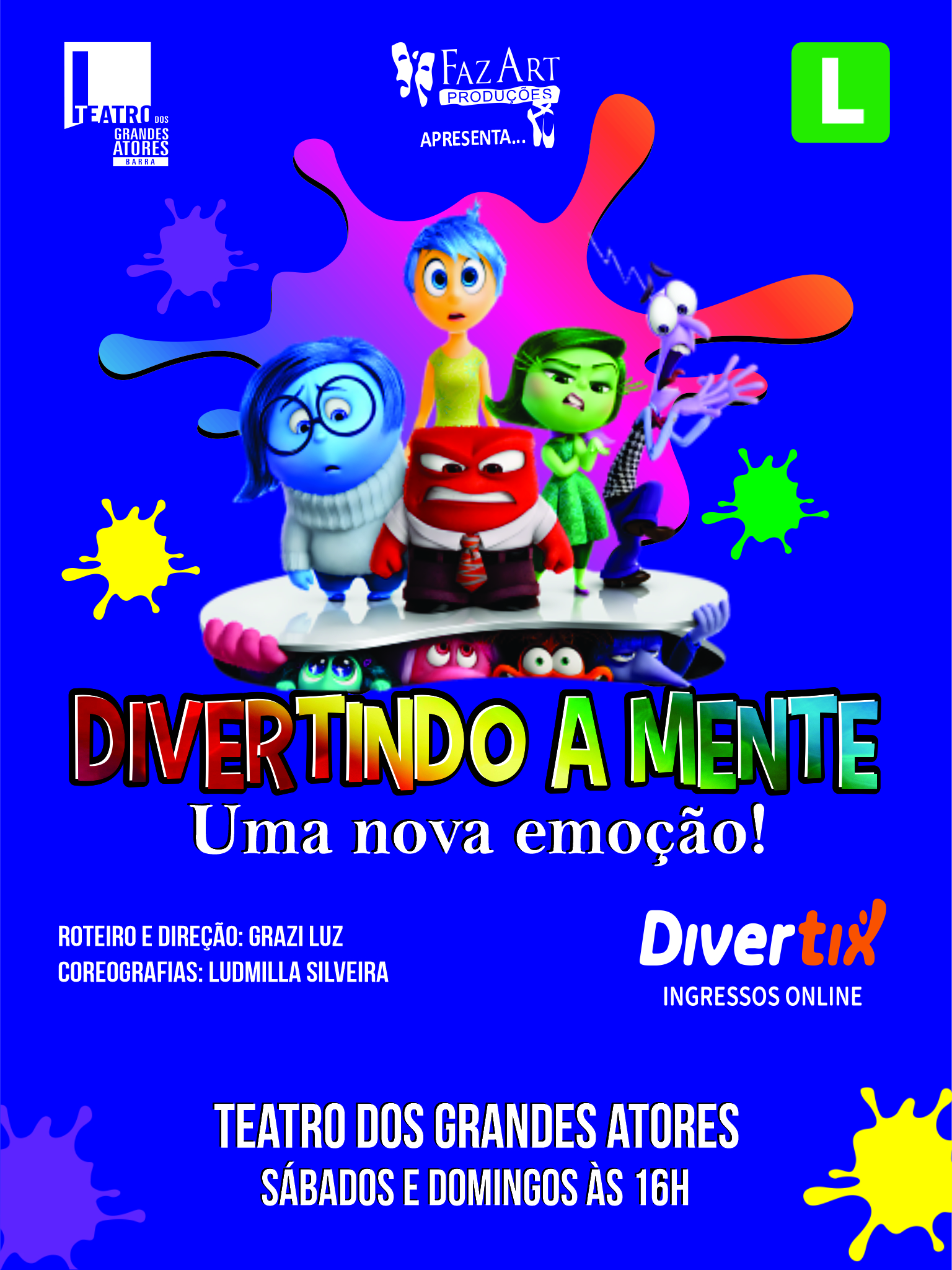 Divertindo a mente, é um espetáculo escrito especialmente para informar e ensinar as nossas crianças a entenderem, de forma lúdica, as emoções e sensações que acontecem dentro do seu coração e pensamentos. Com muitas músicas, danças e alegria, passeamos pelo universo das emoções de Riley. Uma menina que está entrando na sua tão confusa pré-adolescência.